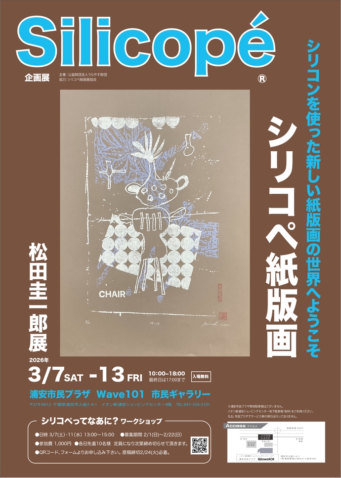 版画家 松田圭一郎氏の版画展「シリコペ紙版画 松田圭一郎展」が浦安市民プラザにて開催されている。会期は、2026年3月7日(土)~3月13日(金)。本展では、シリコペ®で制作した大小約40点が展示される。