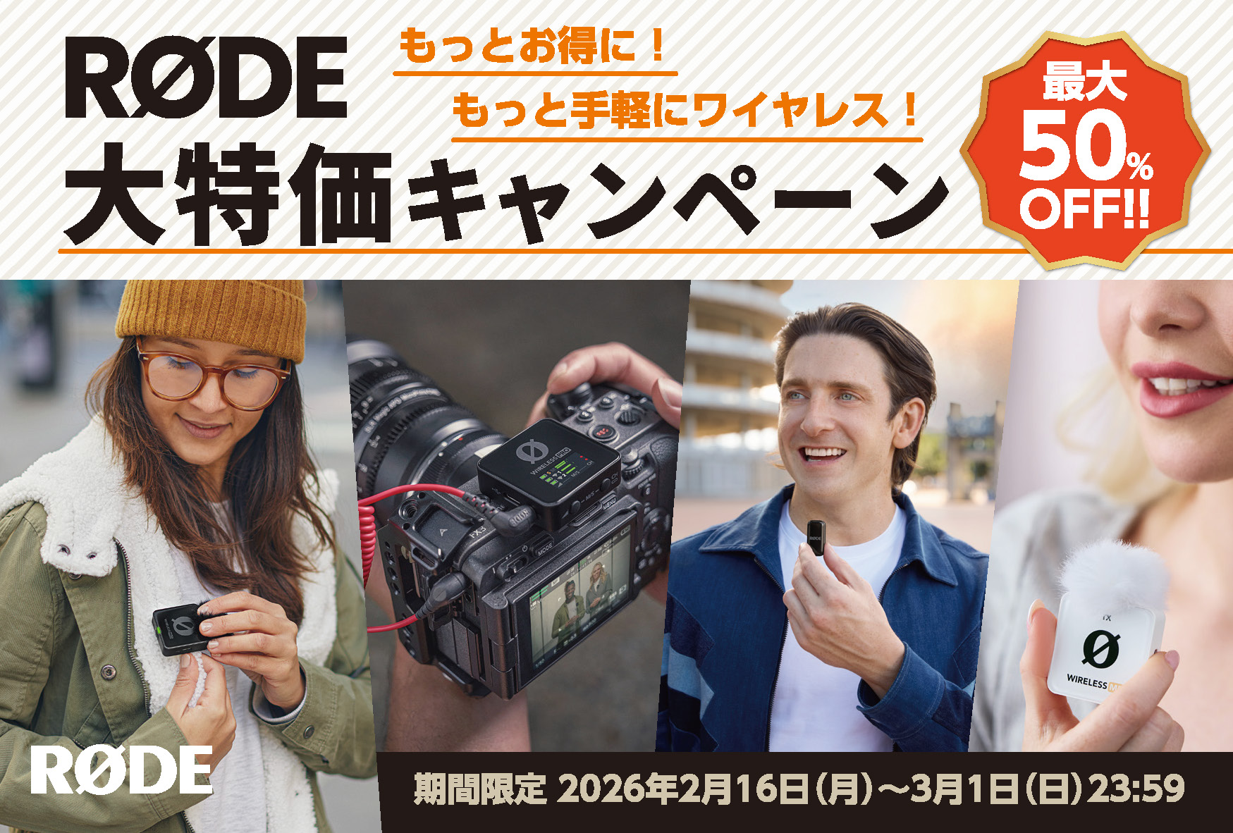 銀一株式会社は、RØDE Microphones(ロードマイクロフォンズ)のワイヤレスマイクを対象に、最大50%OFFの「もっとお得に!もっと手軽にワイヤレス!RØDE大特価 キャンペーン」を開催する。開催期間は、2026年2月16日(月)〜3月1日(日)まで。期間中、対象のRØDEワイヤレスマイクが最大50%OFFの大幅値引きとなる。