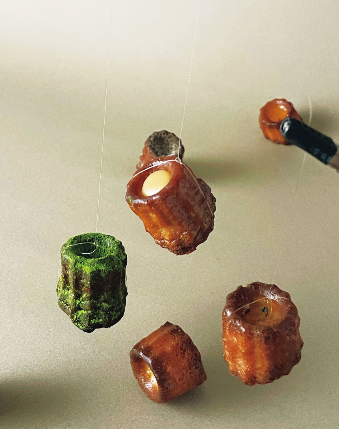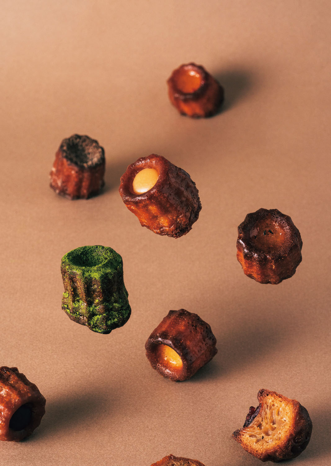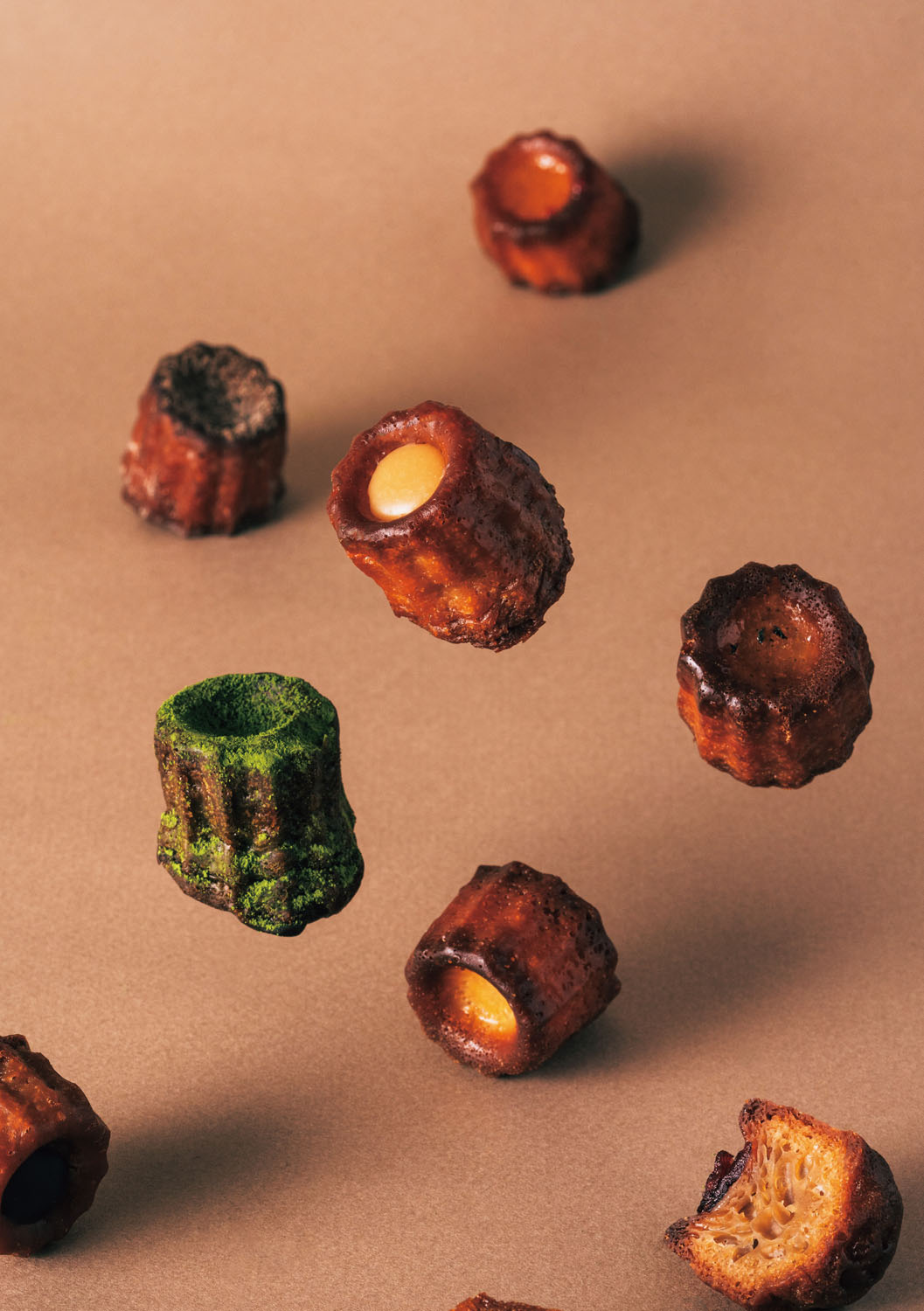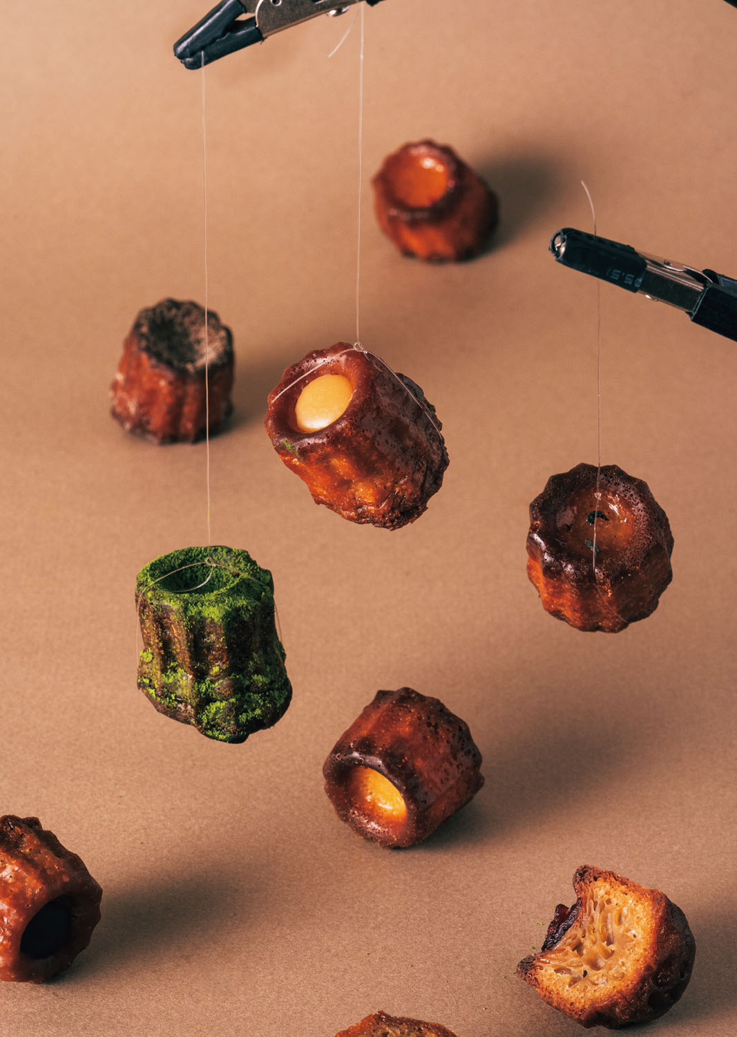 カヌレを宙に浮かせてリズム感のある不思議なお菓子の世界を作り込む