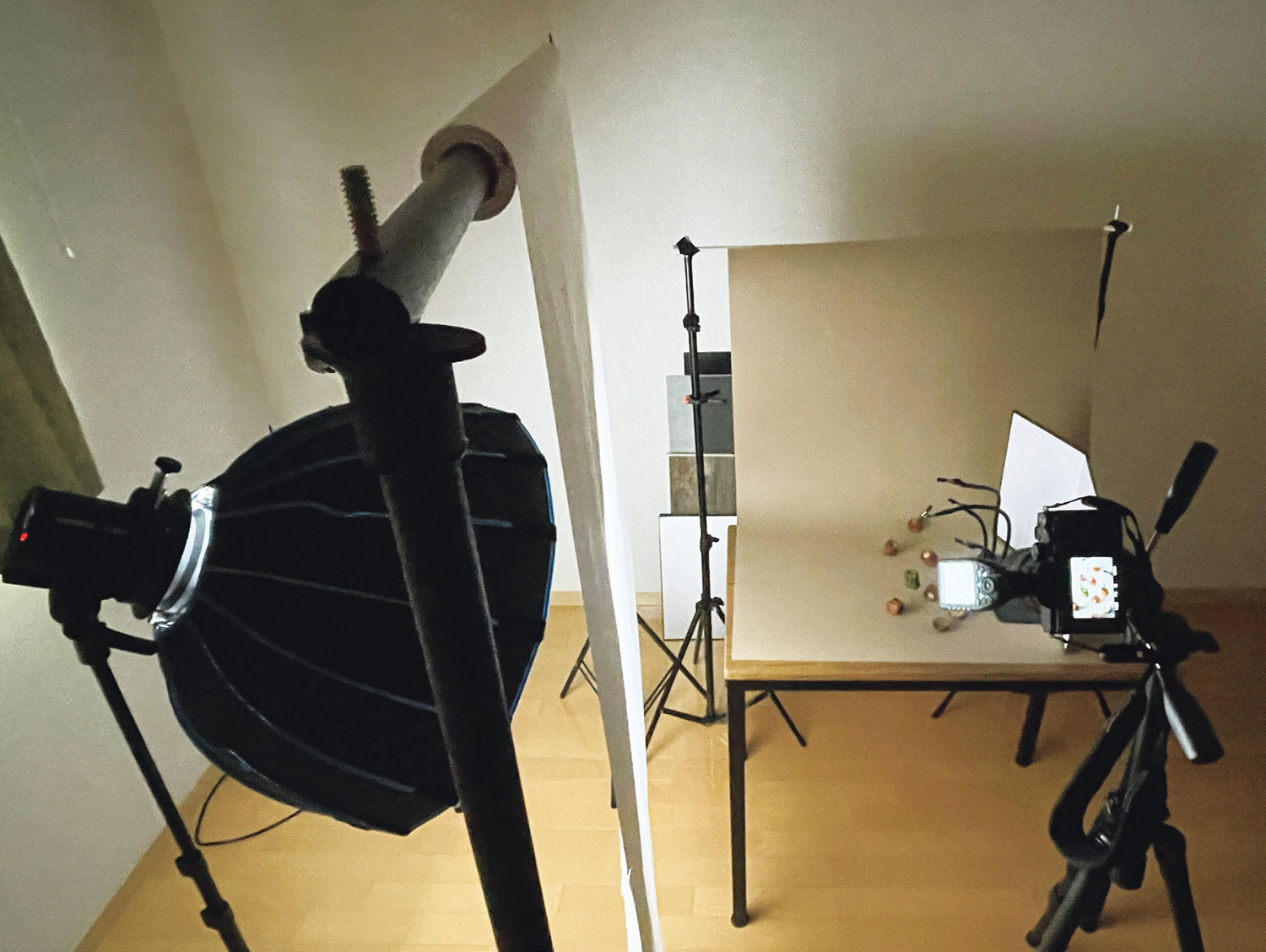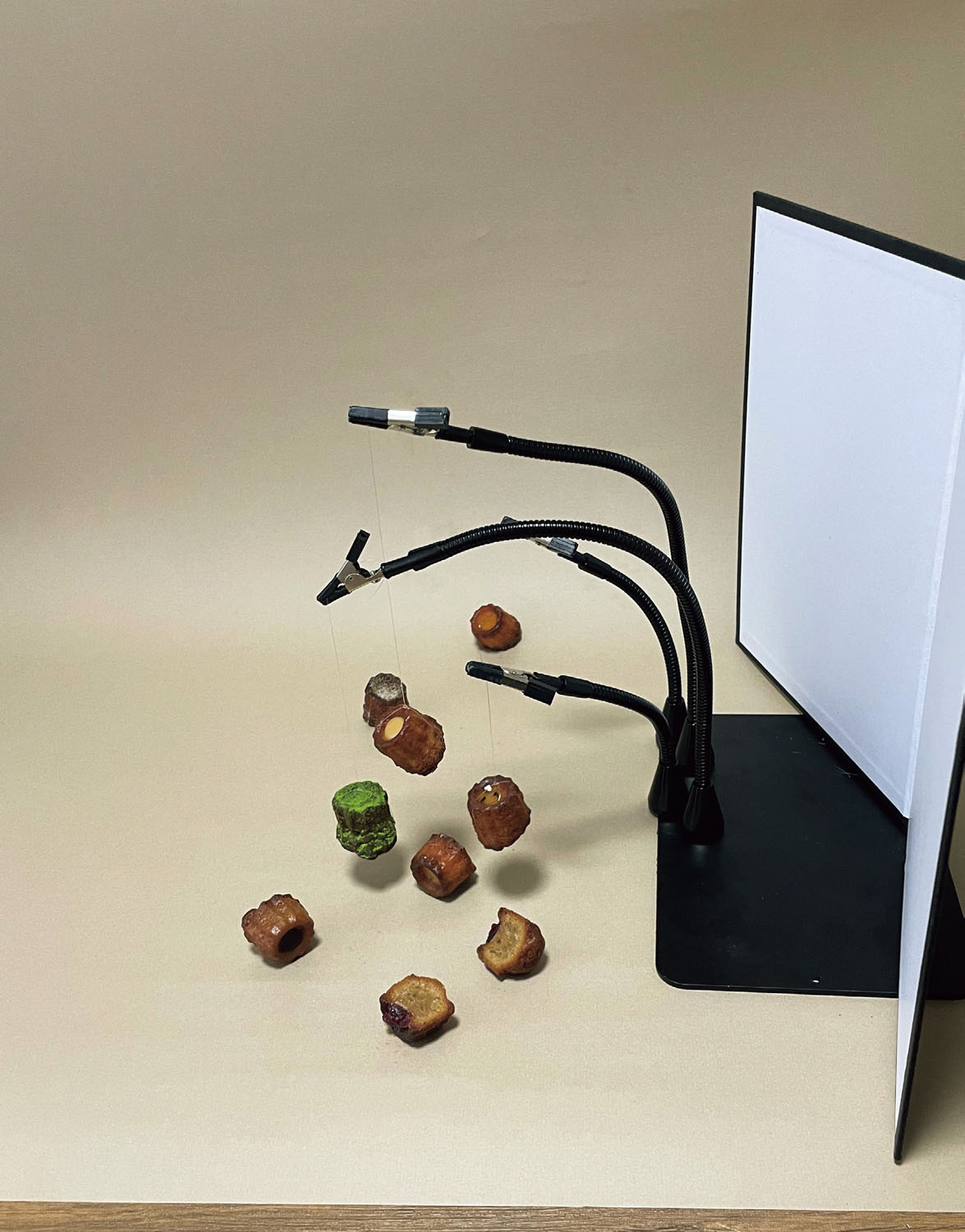 まずはテーブルと背景紙をセット。カヌレの色味に合うよう、同系色を選びます。カヌレを吊るす準備は、透明な テグスにカヌレを縦に縛っておきます。フレキシブルアームを使い、テグスをつけた3個のカヌレを吊るし、それぞれ高さや角度を変えて配置。カヌレが落ちた瞬間を表現するため、背景紙の上に置くカヌレも立たせたり横にしたりして、手前と奥に配置しました。断面も見せたかったので割ったものをひとつ取り入れました。
