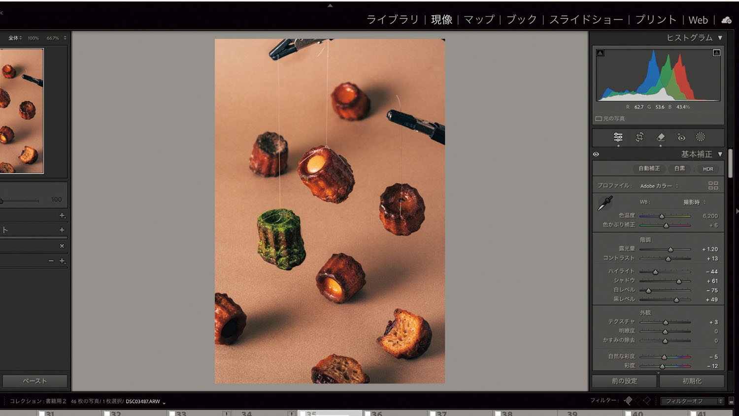 2~3個のカヌレが落ちる瞬間をイメージして、カヌレを吊るして撮影することにしました。吊るしたテグスなどは、後からPhotoshopで消していきます。