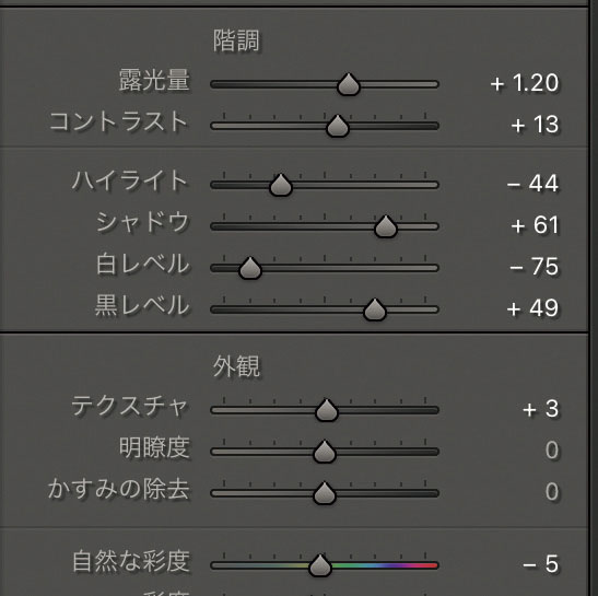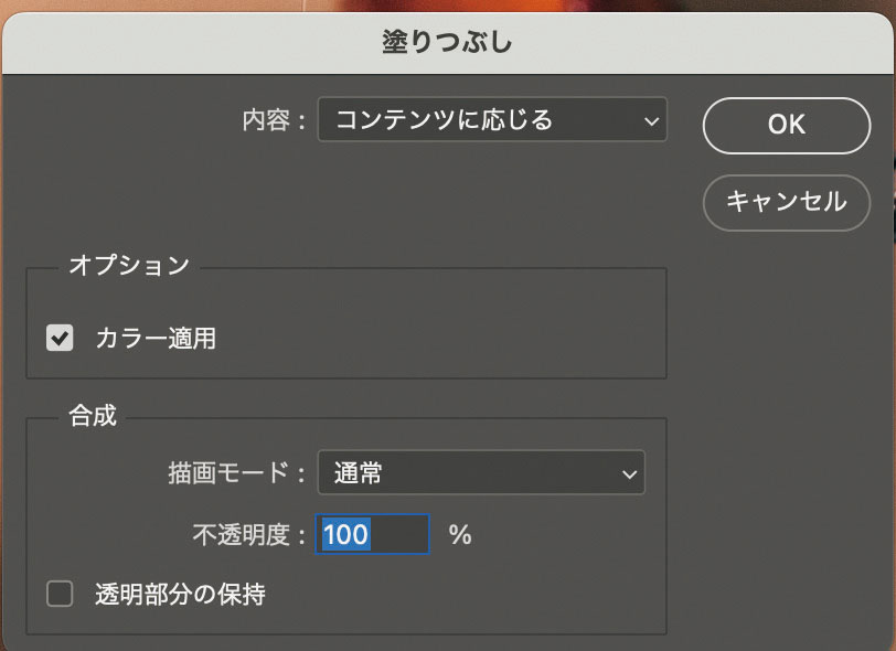 Lightroomの現像では質感を出すためにテクスチャを少し上げ、全体的に彩度は抑えます。現像し終わったら、Photoshopで不要なフレキシブルアームとテグスを消していきます。まずは長方形選択ツールでアームの部分を選択し、右クリック。塗りつぶし→コンテンツに応じるを選んでOKをクリック。選択した部分のアームが消えるので、続いてテグスも消していきます。