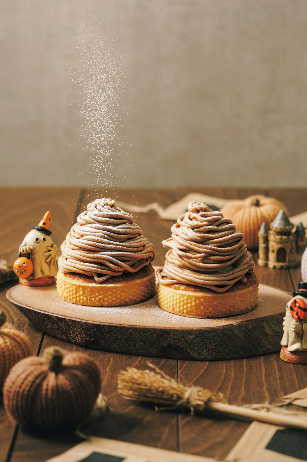 ハロウィンをイメージした季節感のあるスタイリング。木のテーブルに見立てた板に、テーブルに馴染むベージュの画用紙を背景にしました。モンブランを中央に置き、周りにかぼちゃやオバケ、ほうきなど100円ショップで買ったハロウィンの雑貨を置いてハロウィンの世界を作りました。「HELLOWEEN」の旗はチラ見せ程度に置いています。カメラは三脚に固定し、連写にして右手で粉糖をふるいながら左手でシャッターを切っています。