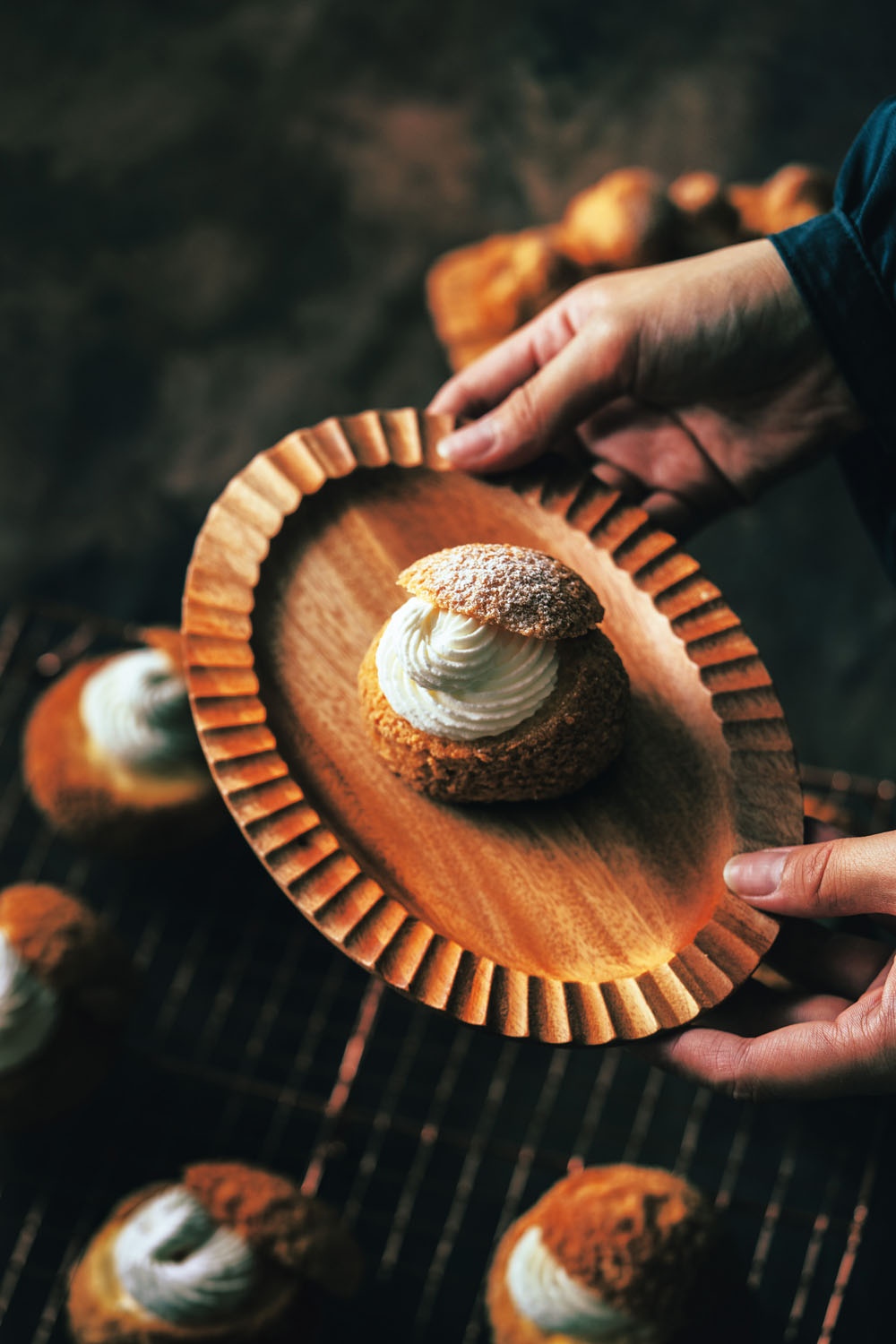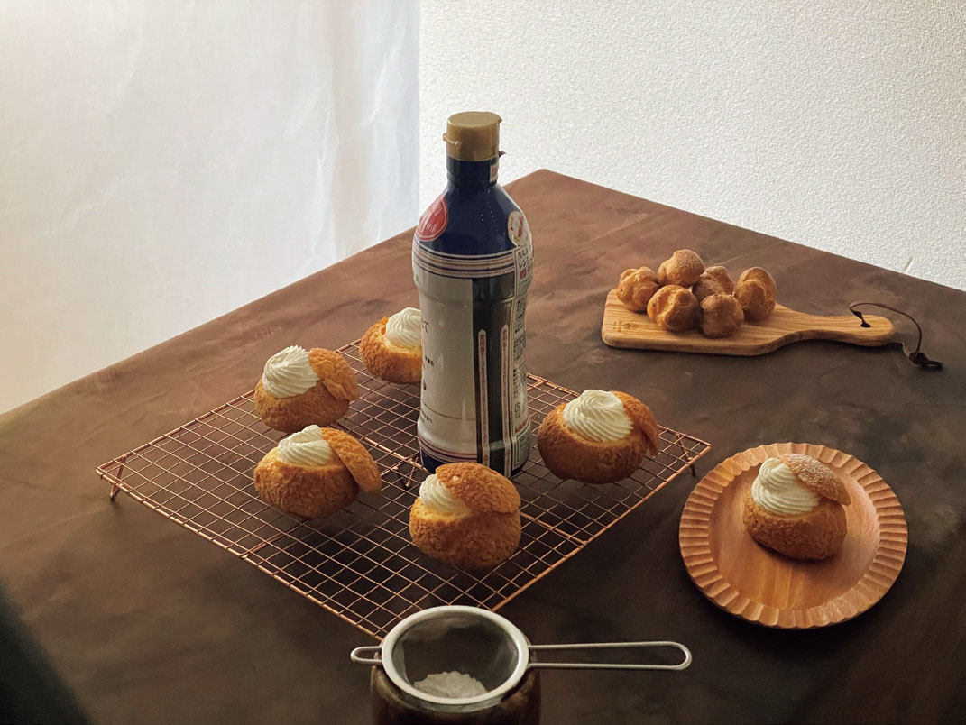 クリームは口金で絞った質感が出るように、柔らかすぎず、ボソボソにならない硬さに作ります。スタイリングは手作り感が伝わるよう、両手で持ったシュークリームのお皿を主役に、背後にケーキクーラーのシュークリームと余った材料で作ったプチシューが見えるようにしました。お皿のシュークリームは下と距離を離し、絞りはF4にして背景から浮き上がるようにします。10秒のセルフタイマーで撮影しました。