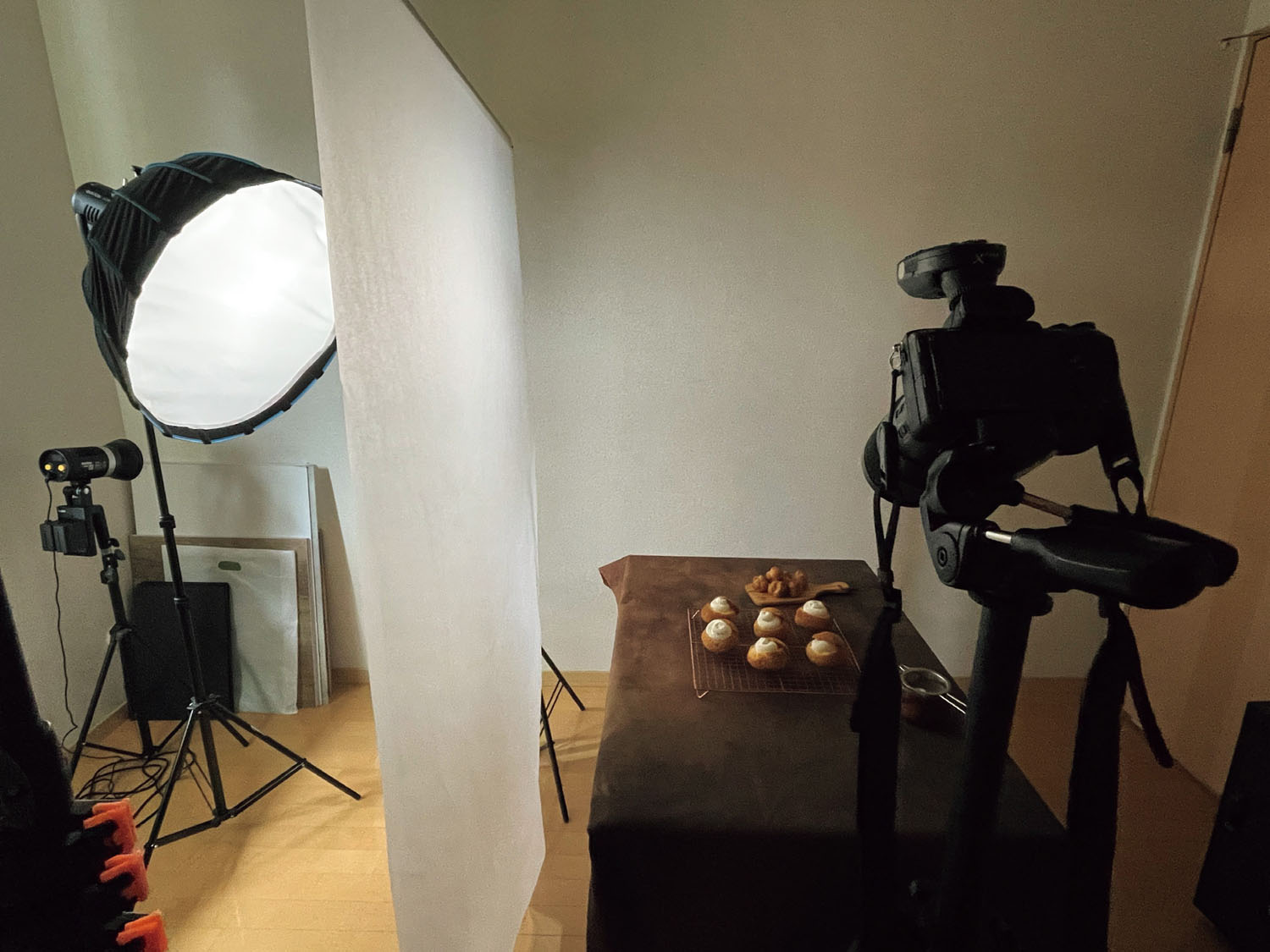 シックで暗めのイメージの光を作りたいと考え、シンプルなストロボ1灯ライティングにしました。ソフトボックスを付けたストロボを左斜め後ろに設置。ストロボとトレペとの距離を離すことで、柔らかく広がる光を送りました。影をしっかりとつけたかったのでレフ板は使わず、背景も黒く落ちるようにシュークリームを中心に光が当たるようにしています。