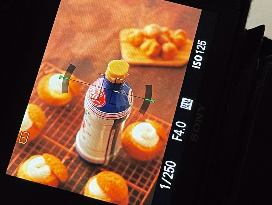 セルフタイマーで撮影する場合は、あらかじめピントを合わせておく必要があります。下のシュークリームとは距離をとりたかったので、高さのあるボトルを用意して上部にピントを合わせ、そこにシュークリームの上部が来るようにしました。