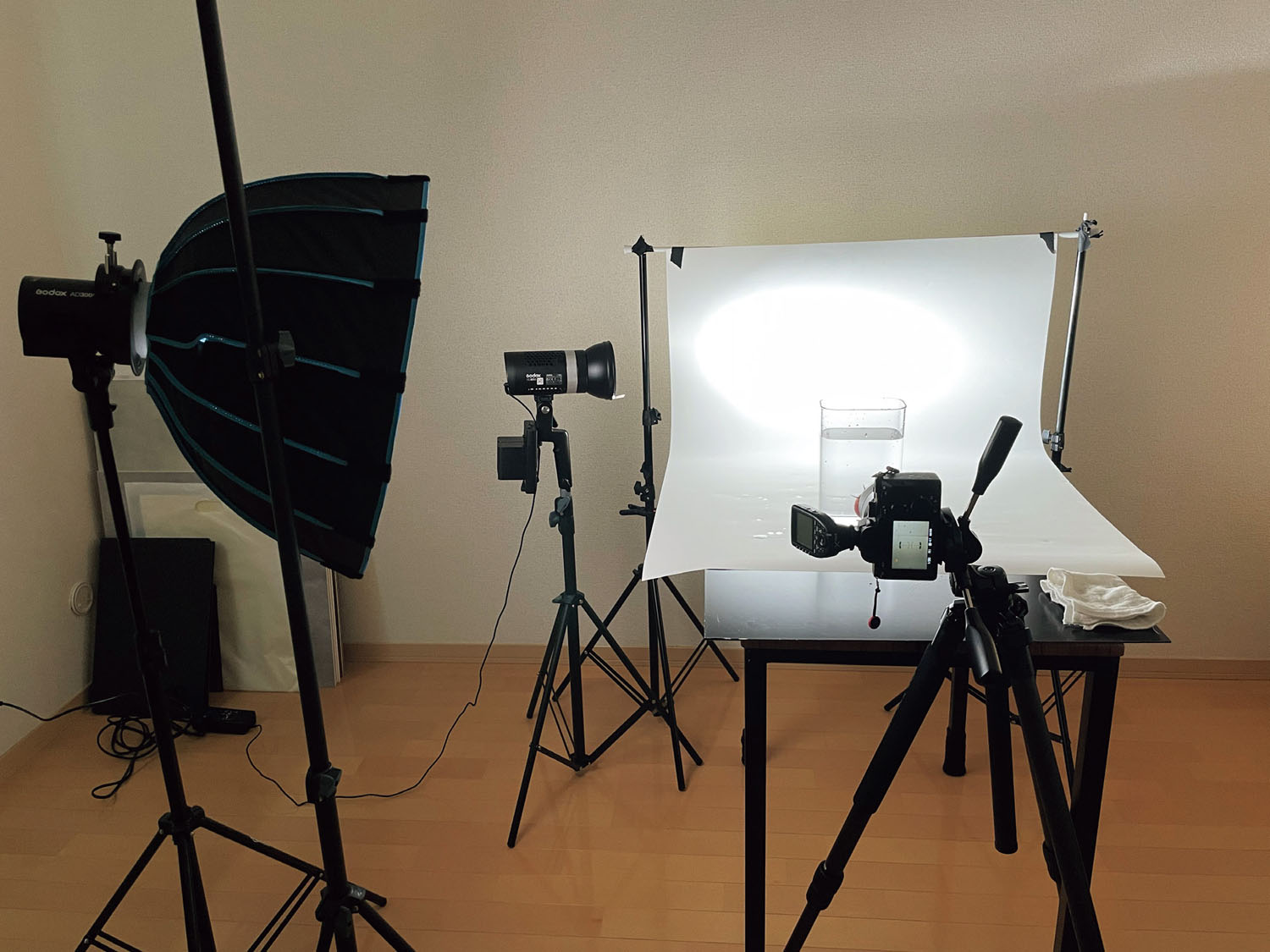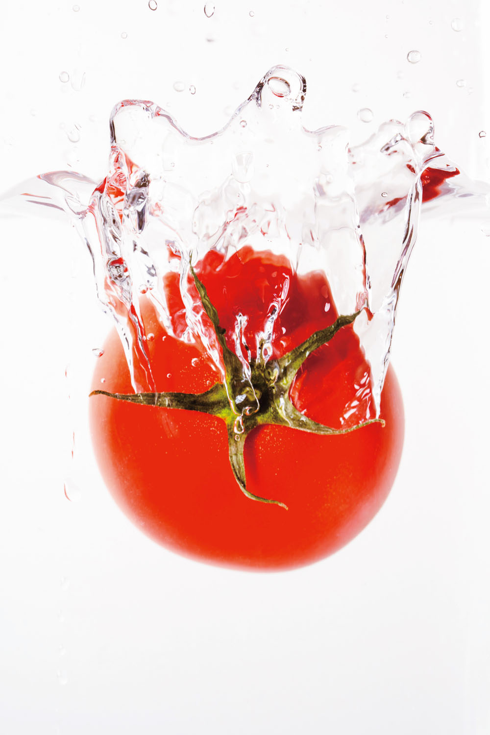 トマトのフレッシュさを表現するため、水の中に落ちる瞬間を撮影することにしました。背景スタンドに白い背景紙をセッティング。寄りで撮影するので、水槽などの大きい容器ではなく、100円ショップで購入した小さめの透明プラスチックの保存容器を使用。そこへ水を入れ、手でトマトを持って連写で何度も水の中に落として撮影しました。ピント位置はMFで固定します。